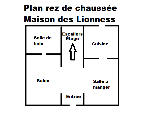 Gen et Elias pénètrent dans la maison en transportant Jean et arrive dans le salon qui est connecté au couloir menant à l’entrée et aux escaliers menant à l’étage. Ce même couloir est relié à la salle à manger.